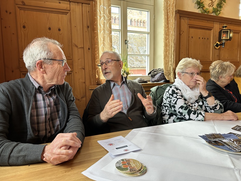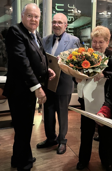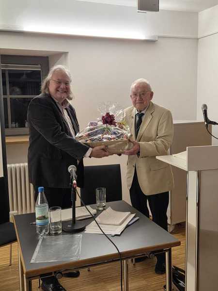 Oft kam im Vortrag der Satz: „da hatte ich Glück gehabt“ vor.Vielleicht ein Geheimnis für sein langes Leben. Glück im Leben zu haben, dieses Glück zu erkennen und zu schätzen. Und dadurch dankbar auf ein langes erfülltes Leben zurückzublicken. Pünktlich nach 1 ½ Stunden endete sein kurzweiliger Vortrag, mit den Worten „ so die Zeit ist um„ obwohl man ihm noch lange hätte zuhören können. Matthias Stier überreichte Herrn Peter noch einen Präsentkorb vom Freundeskreis Hockenheim-Commercy, viele Zuhörer gratulierten ihm noch zu seinem 100. Geburtstag.
